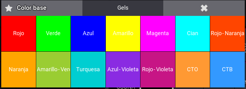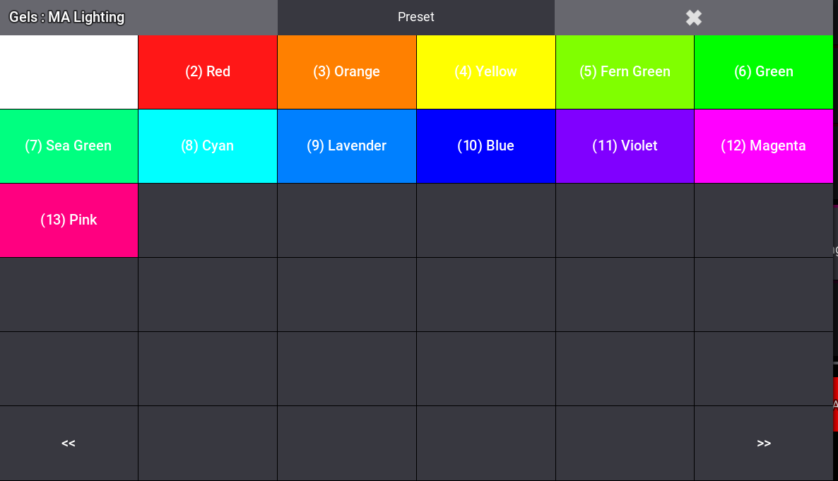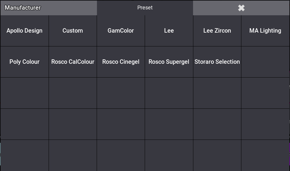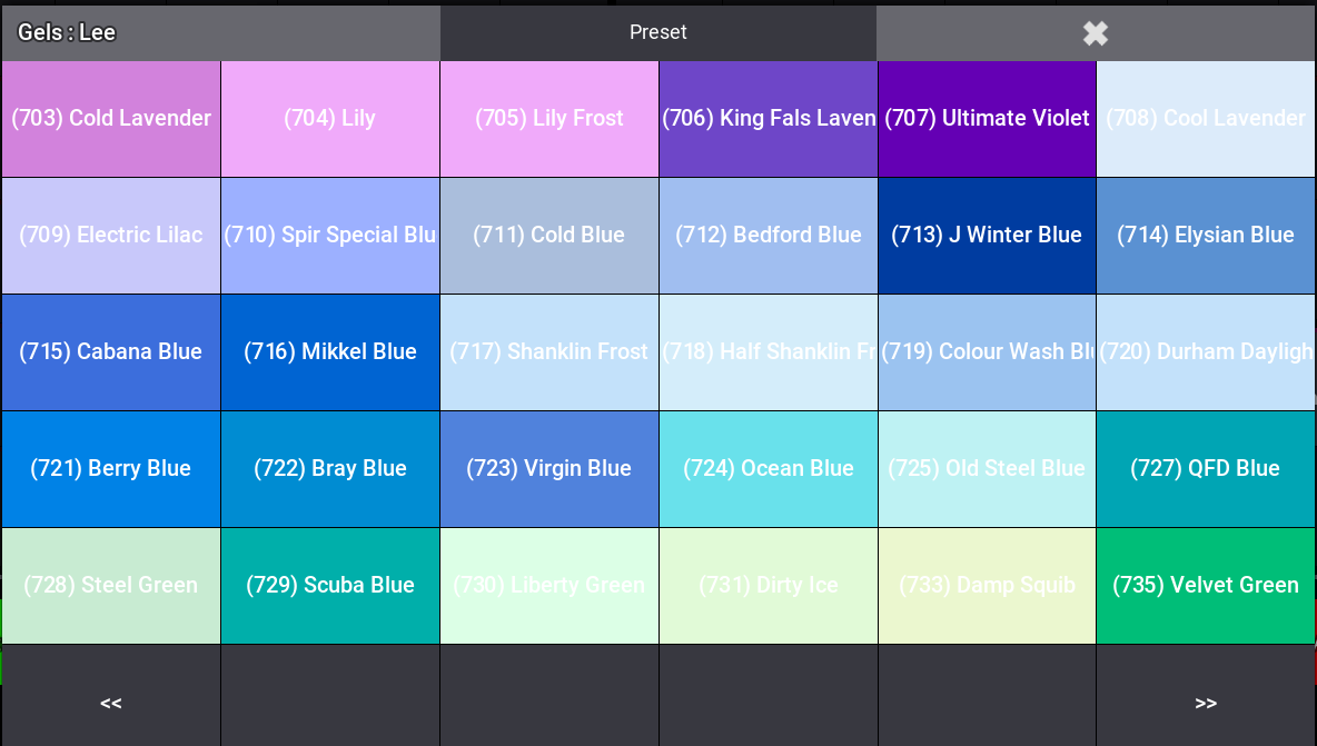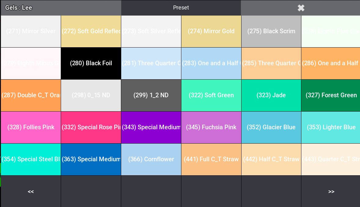 - Browse Presets or Gel libraries (filter by manufacturer, page through gel pools, select individual gels).